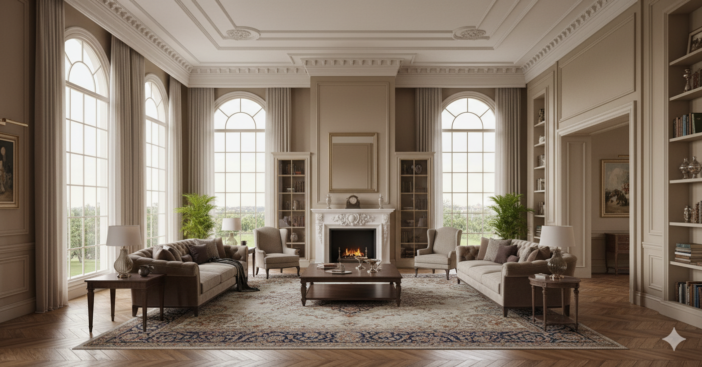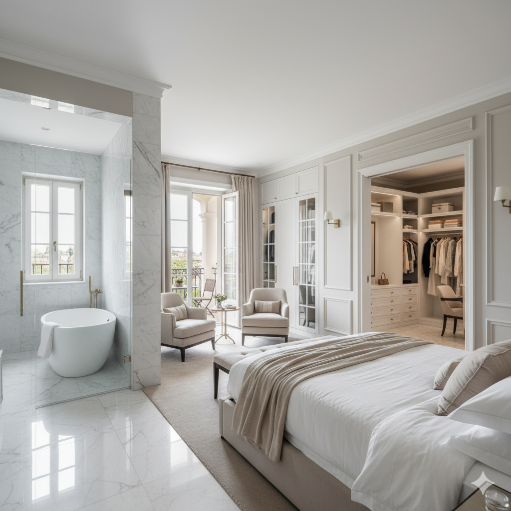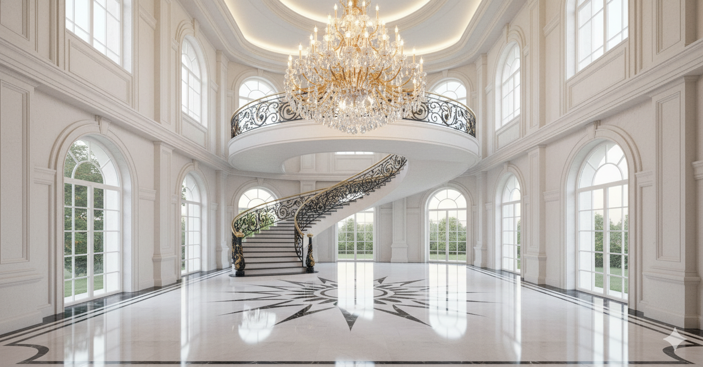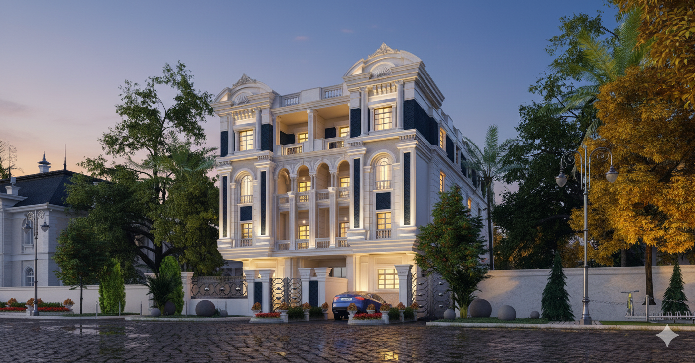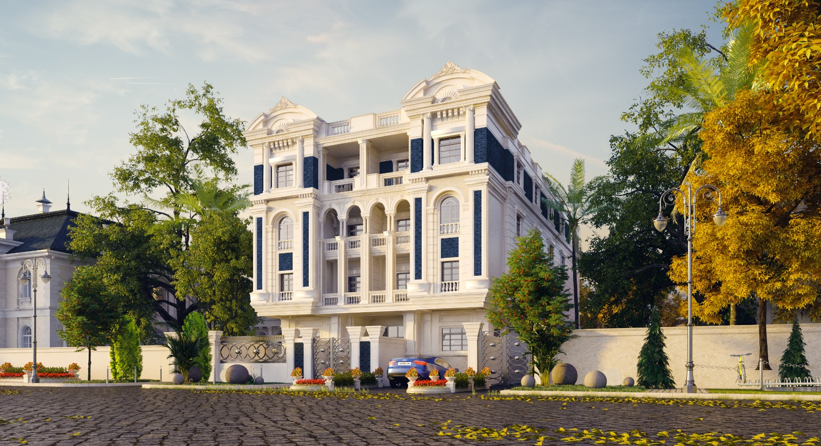 Palatial Classical Architecture: The building’s exterior is a stunning showcase of neoclassical design, featuring grand columns, ornate pediments, beautiful arched windows, and decorative balustrades that evoke a sense of European luxury.