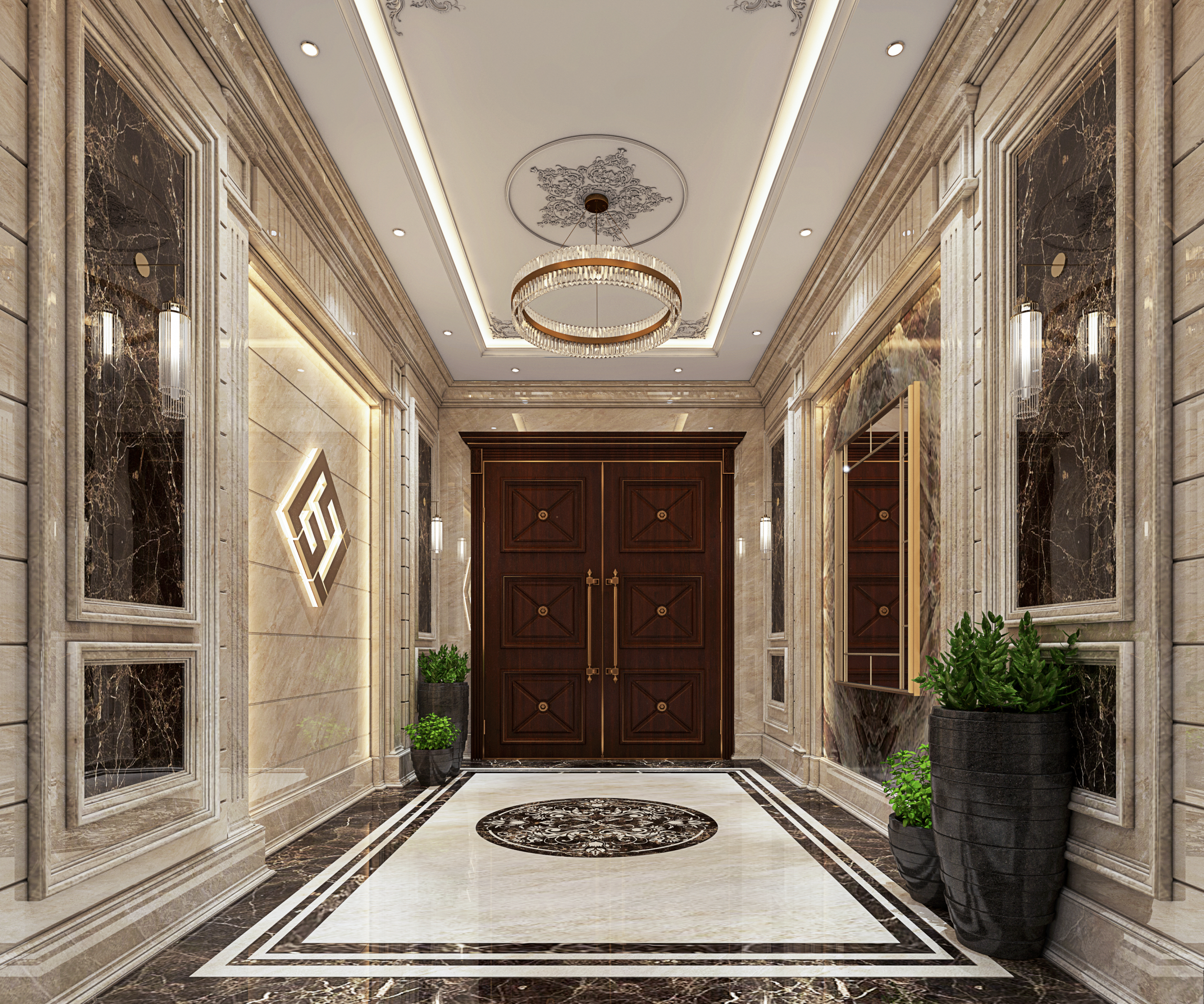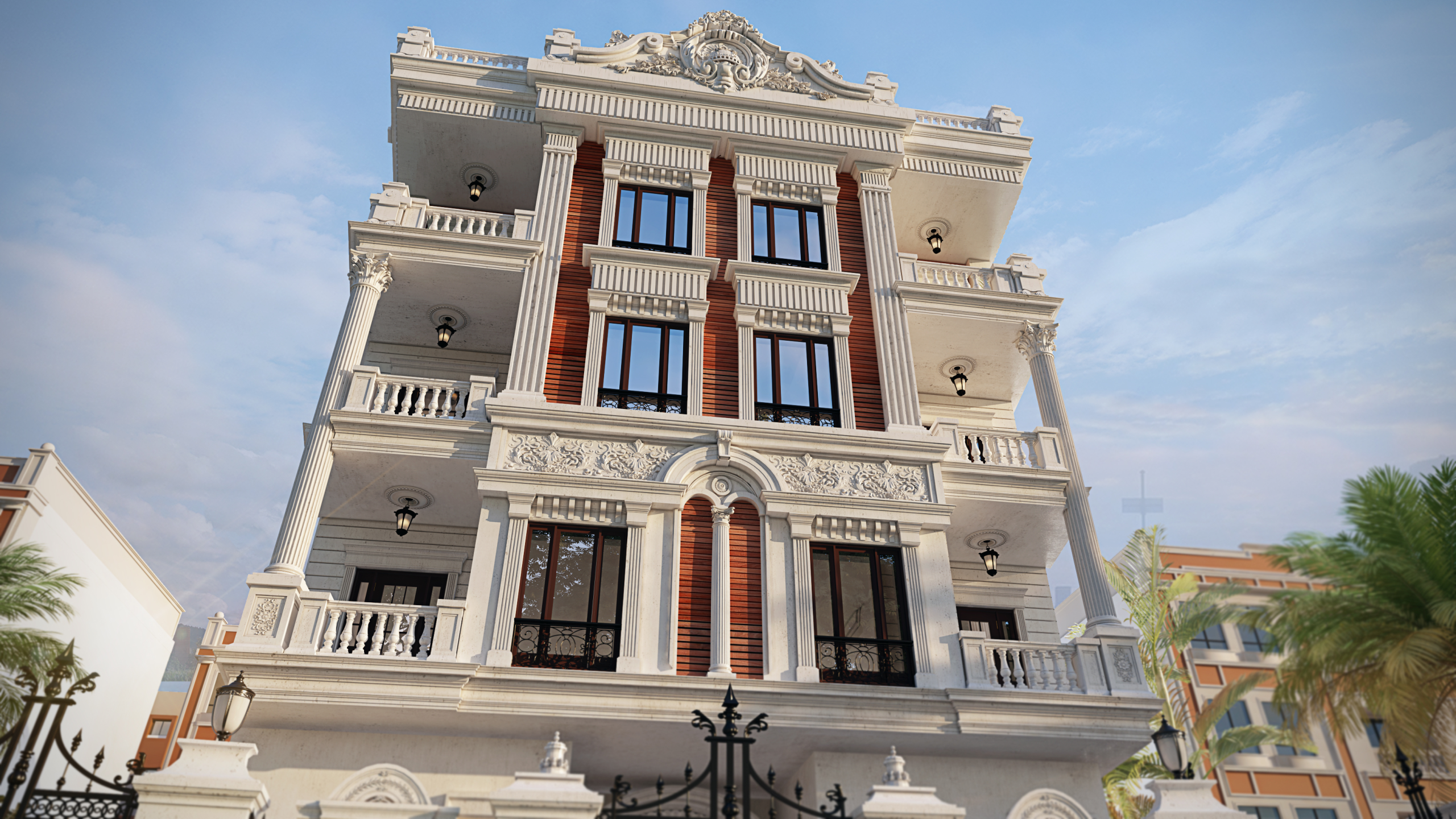 Palatial Neoclassical Facade: The building’s exterior is a showcase of classic architectural principles, featuring ornate carvings, majestic Corinthian columns, and beautifully crafted wrought-iron balconies that create an aura of sophistication and prestige.