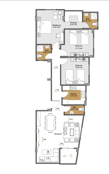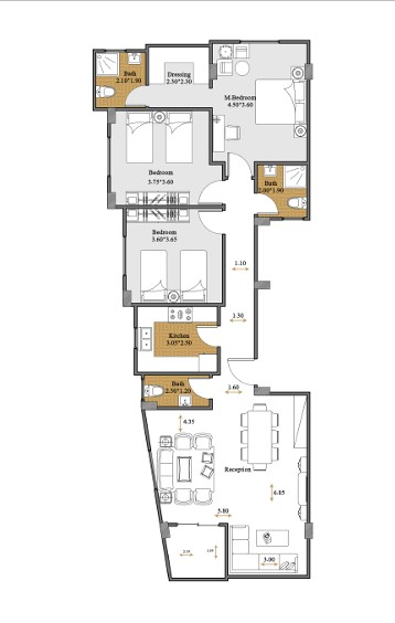 | Master Bedroom | 4.50 x 3.60 m | Dressing | 2.50 x 2.30 m |