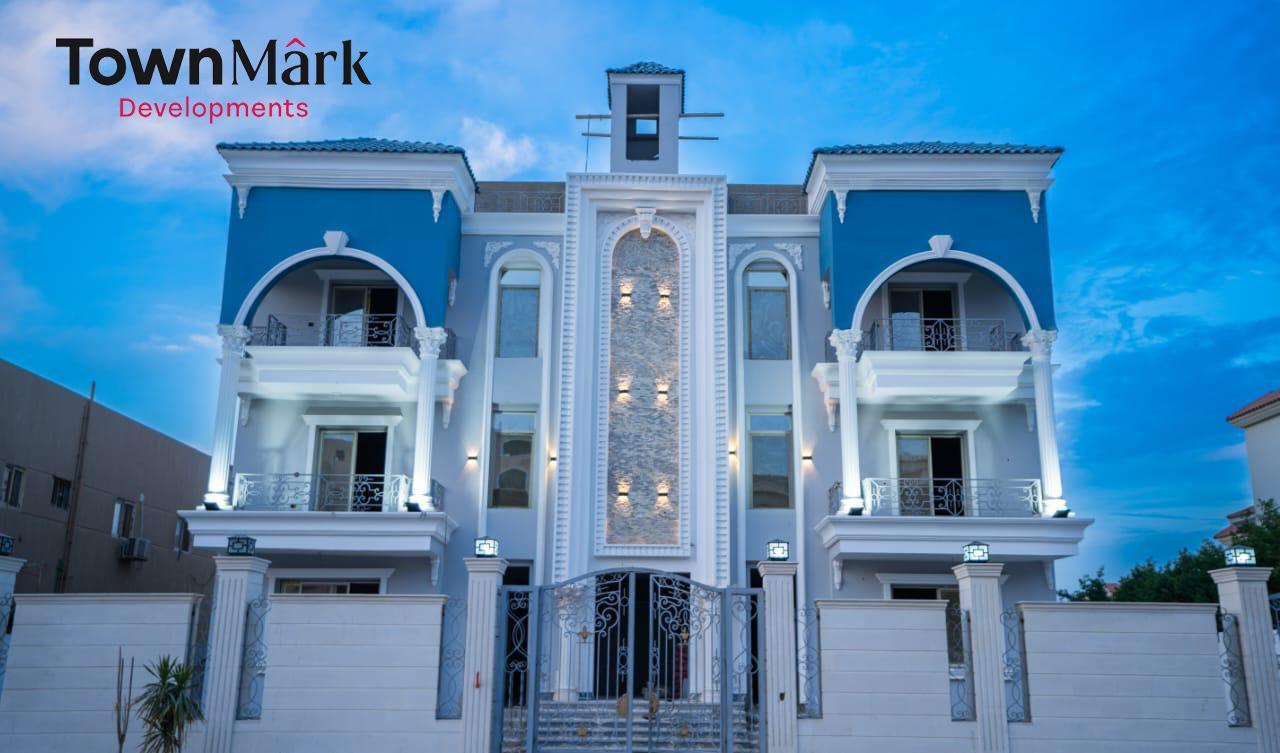 Elegant Architectural Design: The villa features a timeless facade with classic columns, grand arched balconies, and a distinctive color palette, making it a true landmark within the compound.
